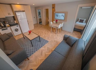 Deluxe 3 Yatak Odalı Apart Daire, 78 m² ferah yaşam alanı ile konforu ön planda tutan geniş bir konaklama sunar. İki Queen yatak, bir tek kişilik XL yatak ve iki çift kişilik çekyat kapasitesiyle 9 kişiye kadar uygundur. Tam donanımlı mutfak, modern banyo, yüksek hızlı Wi-Fi ve verandaya açılan geniş salon ile hem kısa hem de uzun konaklamalar için idealdir. Bahçe manzarası ve ücretsiz otopark da sunulur.