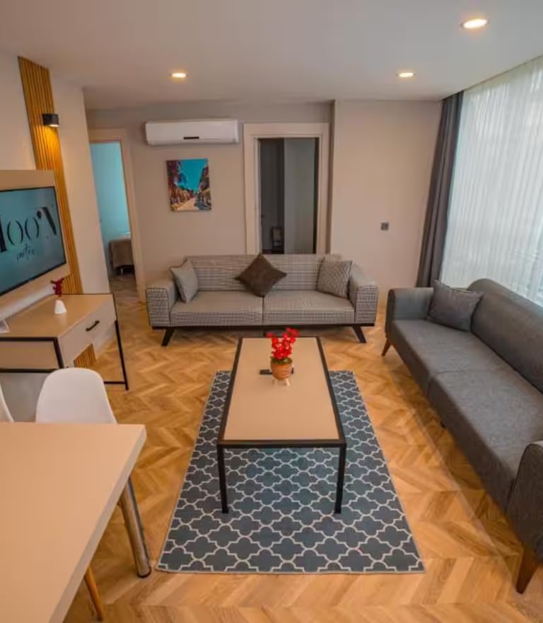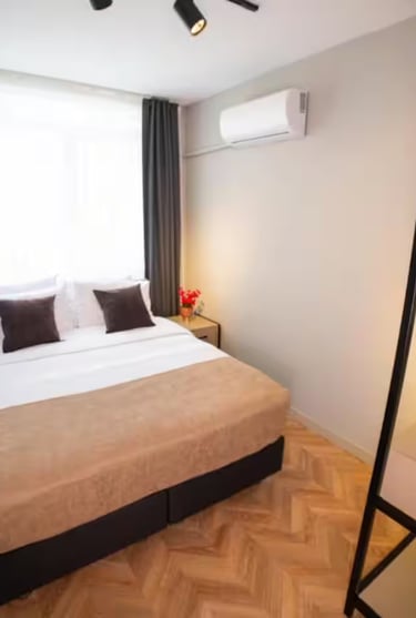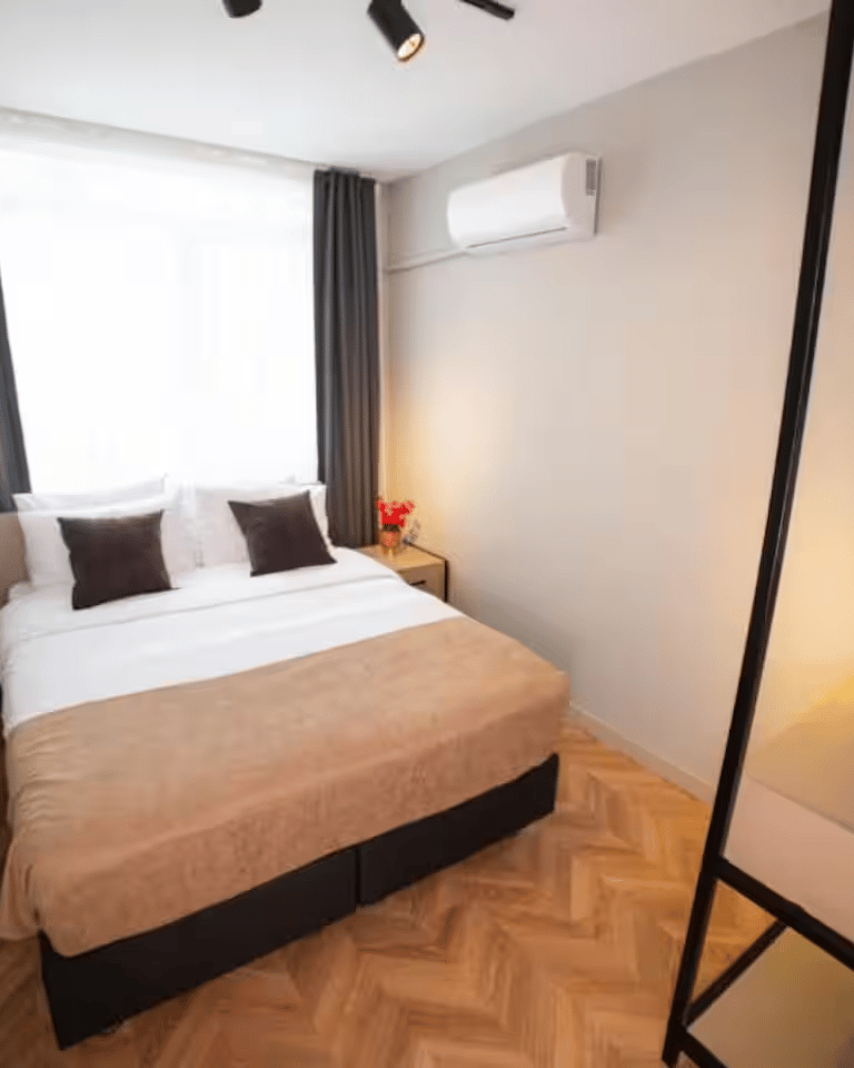 This stylish 58 m² apartment features two bedrooms with a Queen bed, one XL single bed, and two double sofa beds, offering space for up to 7 guests. With a fully equipped kitchen, modern bathroom, air conditioning, fast Wi-Fi, and relaxing garden views, it’s ideal for extended stays and families. Free parking available.