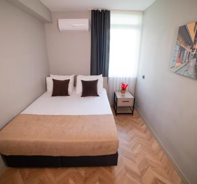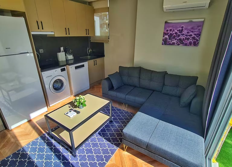 Grand Apart Daire, 85 m² geniş yaşam alanı ve üç yatak odasıyla büyük aileler ve kalabalık gruplar için mükemmel bir seçenektir. İki Queen yatak, bir tek kişilik ranza ve bir çift kişilik çekyat ile toplam 10 kişiye kadar konaklama imkânı sunar. Tam donanımlı mutfak, modern banyo, hızlı Wi-Fi ve verandaya açılan ferah yaşam alanı ile ev konforu sağlar. Ücretsiz otopark ve bahçe manzarası mevcuttur.