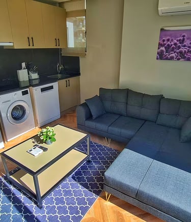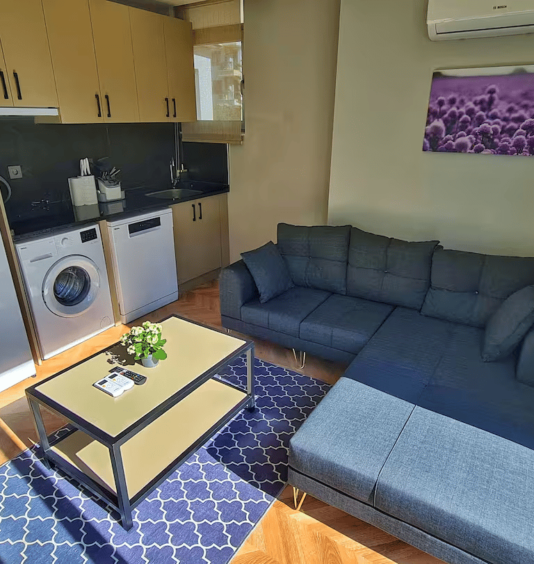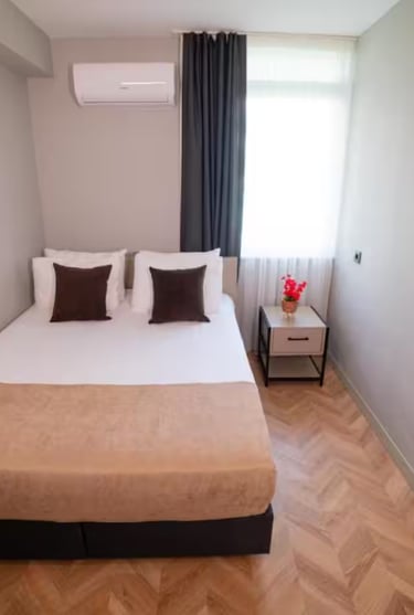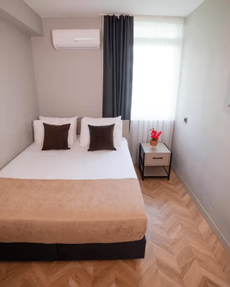 The Grand Apart Suite offers 85 m² of spacious living with three bedrooms, including two Queen beds, a single bunk bed, and a double sofa bed—ideal for up to 10 guests. A fully equipped kitchen, modern bathroom, veranda access, and garden views create a comfortable home-like environment. High-speed Wi-Fi and free parking are provided.